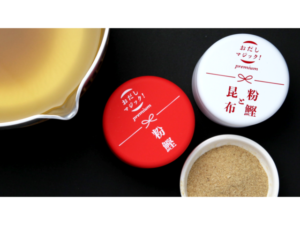 西伊豆・田子で古からの伊豆手火山式焙乾製法を守り続け、食の世界遺産に認定された伊豆田子節本枯節を製造する創業140年超の名店・カネサ鰹節商店の伊豆手火山式焙乾製法本枯節100%の粉鰹と本枯節粉に北海道産真昆布粉を素材際立つ絶妙な比率でブレンドした粉だしは、日常使いのライン2種と、ギフト用のプレミアムライン2種、合計4種のラインアップです。